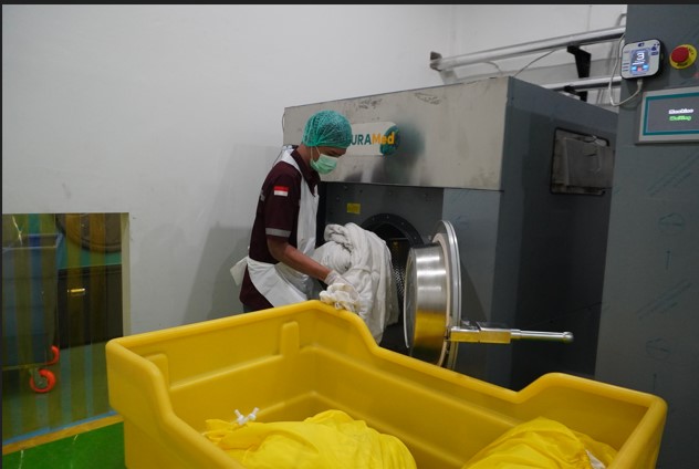 - Menggunakan mesin laundry industrial
